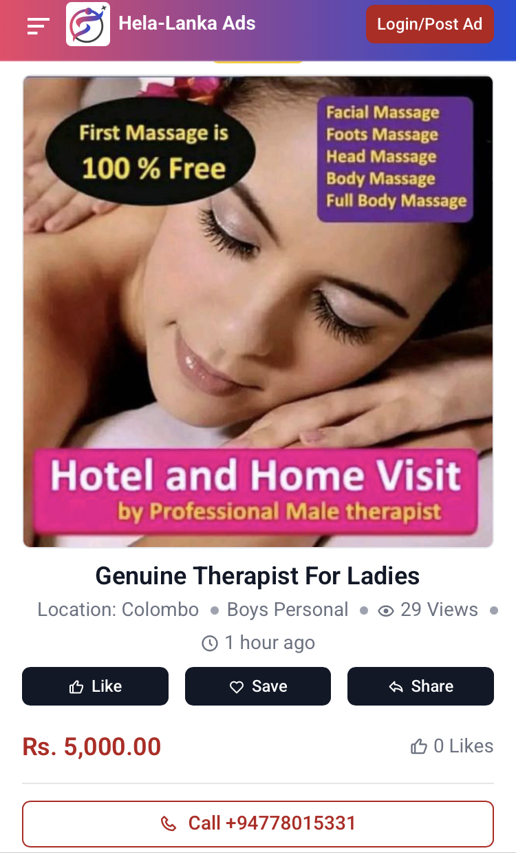 • Colombo area ( Any time) male for ladies female to unisex )